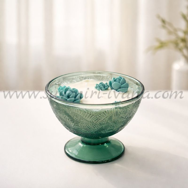 Свещта е поставена в красива стъклена купичка с релефна текстура, която придава допълнителна естетика и я прави подходяща както за декорация, така и за подарък. Декоративните елементи върху повърхността също са изработени от восък и допринасят за уникалната визия на продукта.
