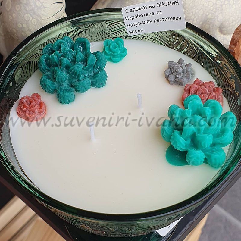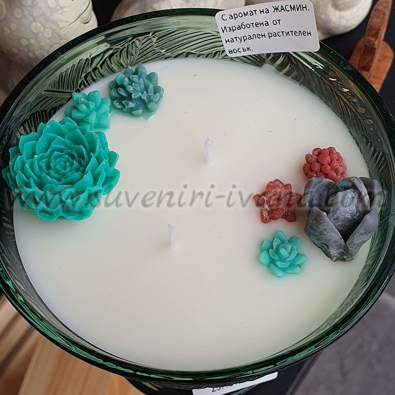 Елегантна ароматна свещ с нежен аромат на жасмин, излята ръчно от натурален растителен восък. Поставена в стилна стъклена купа с декоративни восъчни елементи – идеален акцент за уют и подарък.