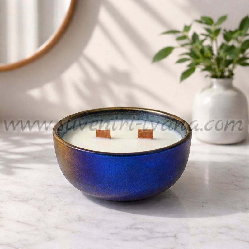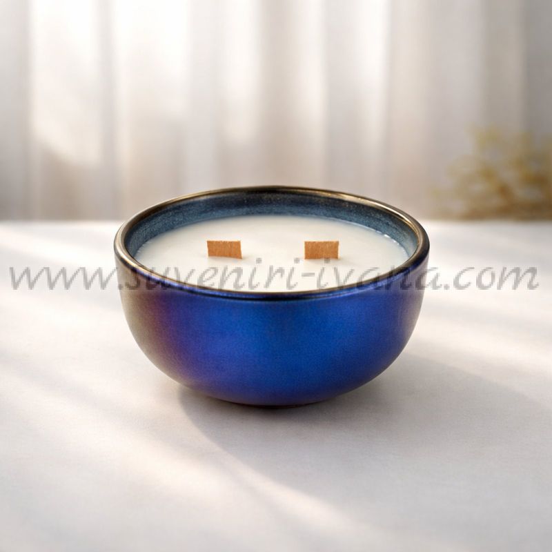 Разположена в модерна керамична купичка с наситен син цвят, тя е не само ароматен аксесоар, но и стилен декоративен елемент за дома. Подходяща е както за подарък, така и за лично удоволствие.