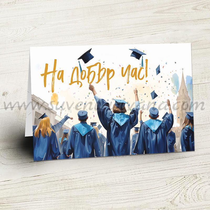 Направете дипломирането още по-специално с тази елегантна поздравителна картичка „На добър час“. Дизайнът с дипломиращи се младежи и академични шапки придава изискан и празничен вид, подходящ за важния момент. Картичката е с по-голям размер и включва плик, което я прави идеална за поднасяне на лично послание, пожелание или паричен подарък.