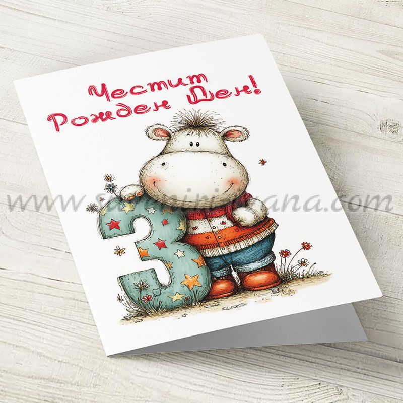 Зарадвайте малчугана с тази весела поздравителна картичка „Честит рожден ден“. Дизайнът със симпатично хипопотамче и цифра 3 я прави идеална за празнуване на трети рожден ден.