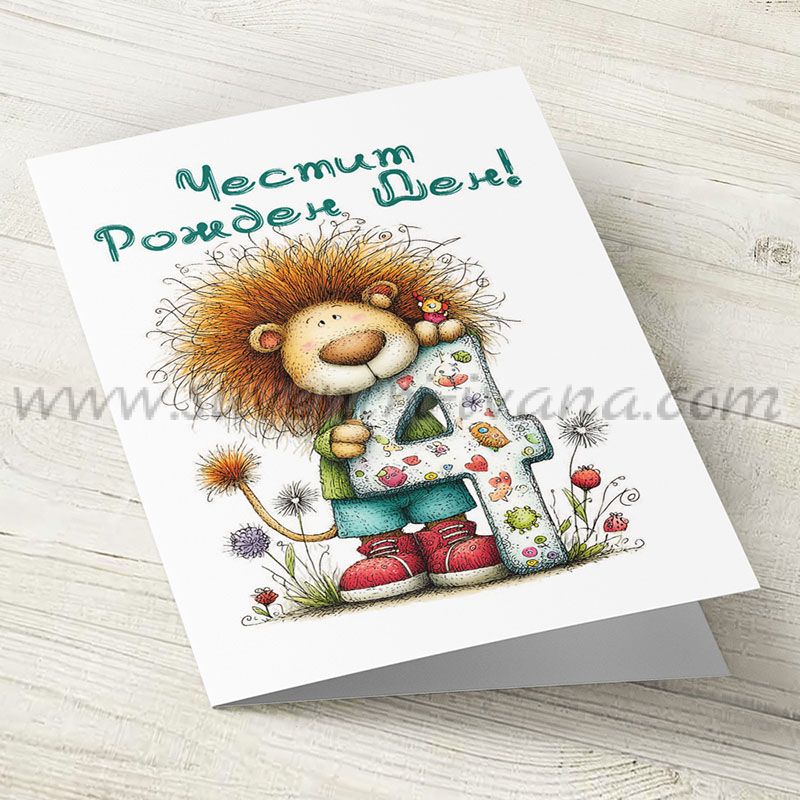 Голяма поздравителна картичка за четвърти рожден ден с лъвче и плик