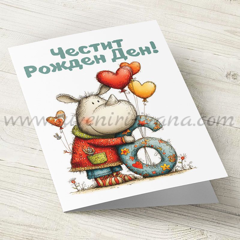 Картичка за 6-ти рожден ден с весела илюстрация на носорог, който държи голяма декоративна цифра 6. Дизайнът е цветен, игрив и подходящ за деца.