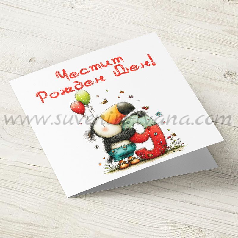 Зарадвайте детето с тази забавна поздравителна картичка „Честит рожден ден“. Дизайнът със симпатична птица тукан, балони и цифра 9 я прави чудесен избор за отбелязване на девети рожден ден.