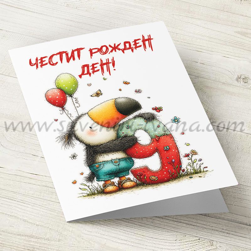 Картичка за 9-ти рожден ден с весела илюстрация на птица тукан, която държи голяма декоративна цифра 9. Дизайнът е цветен, игрив и подходящ за деца.
