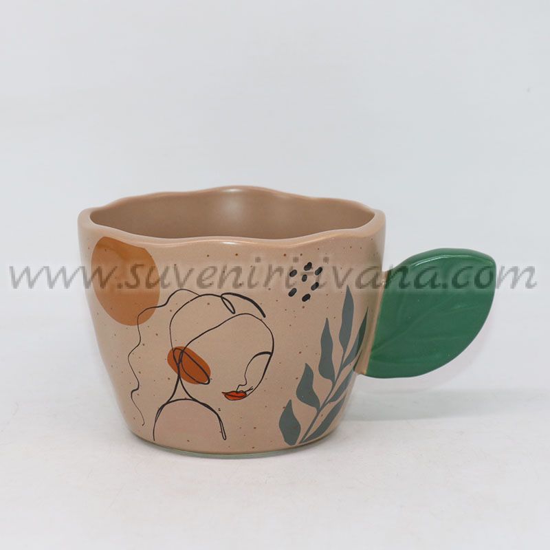 Керамична чаша с артистичен дизайн и дръжка листо – бежов модел с минималистично лице