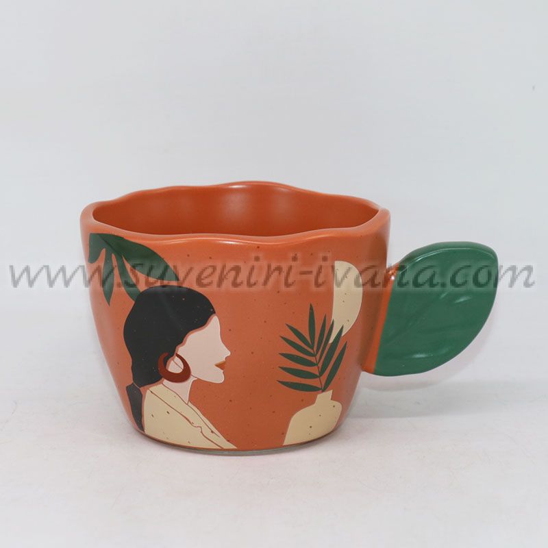 Керамична чаша с артистичен дизайн и дръжка листо – кафяв модел с момиче