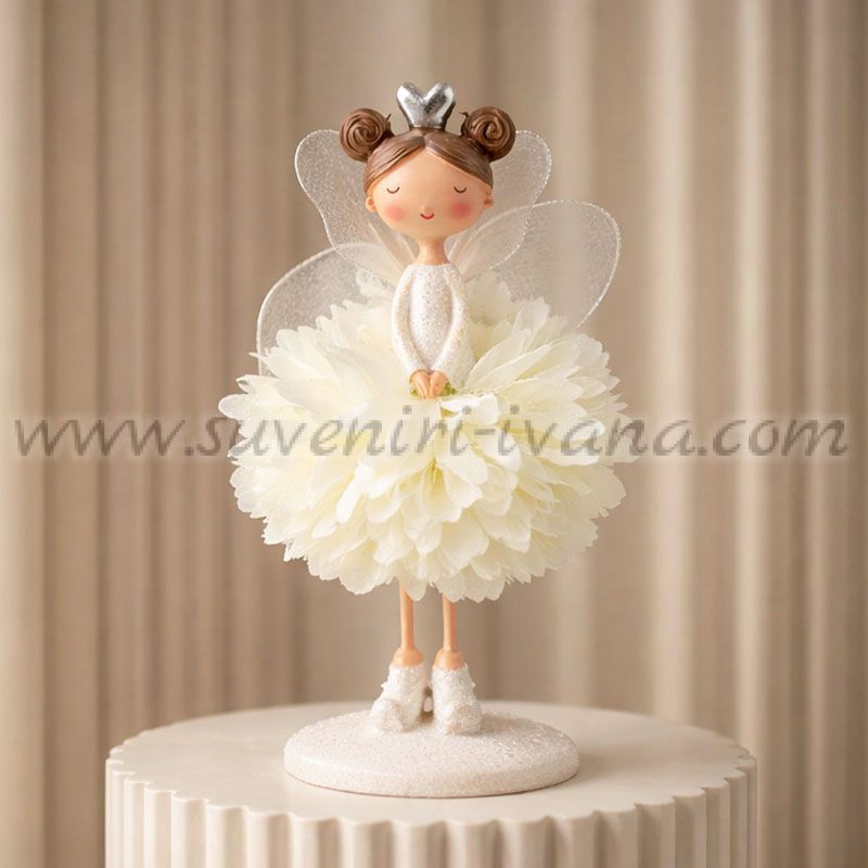 Това красиво декоративно ангелче се отличава с елегантен дизайн и фини детайли. С ефирна рокля, деликатни крила и малка корона с формата на сърце, фигурката създава усещане за нежност и спокойствие.