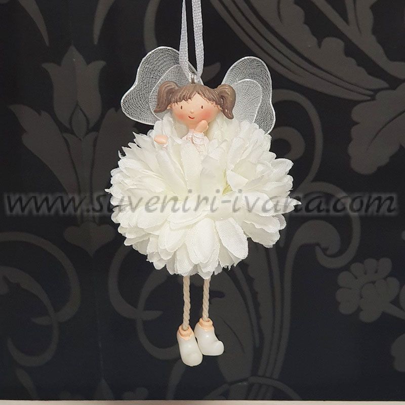 Това красиво висящо ангелче впечатлява със своя нежен и ефирен дизайн. Фигурката е с декоративна рокля от текстилни цветя, деликатни крила и въженце за лесно окачване.