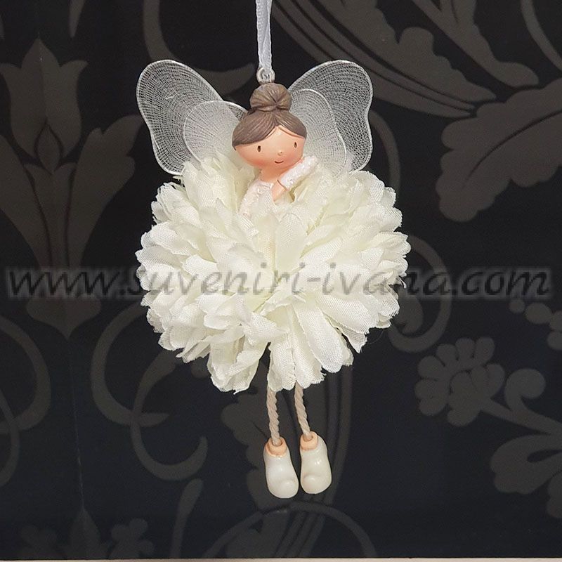 Това елегантно висящо ангелче впечатлява със своя фин дизайн и изцяло бяла рокля, изработена от текстилни елементи. Фигурката е с деликатни крила, стилна прическа с кок и въженце за лесно окачване.