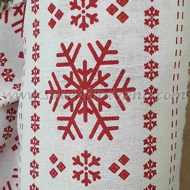Красив коледен плат с класически десен от снежинки, подредени в декоративни вертикални линии. Комбинацията от бял фон и червени елементи създава изчистена и стилна празнична визия.