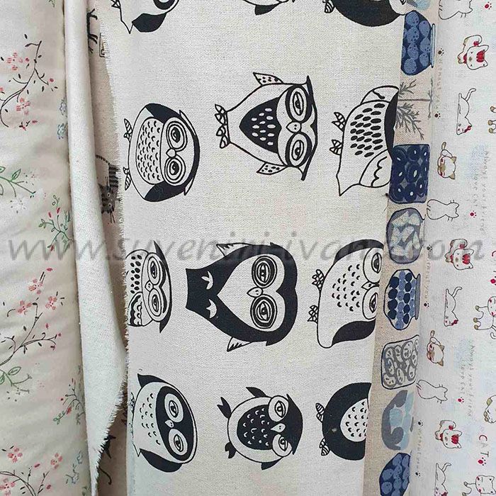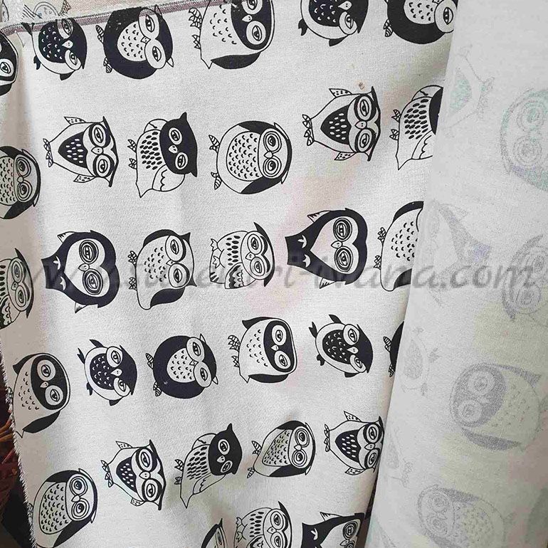 Памучен плат с бухалчета в черно-бял дизайн. Подходящ за детски проекти, декорация и модерни текстилни изделия. Ширина на плата 145 см.