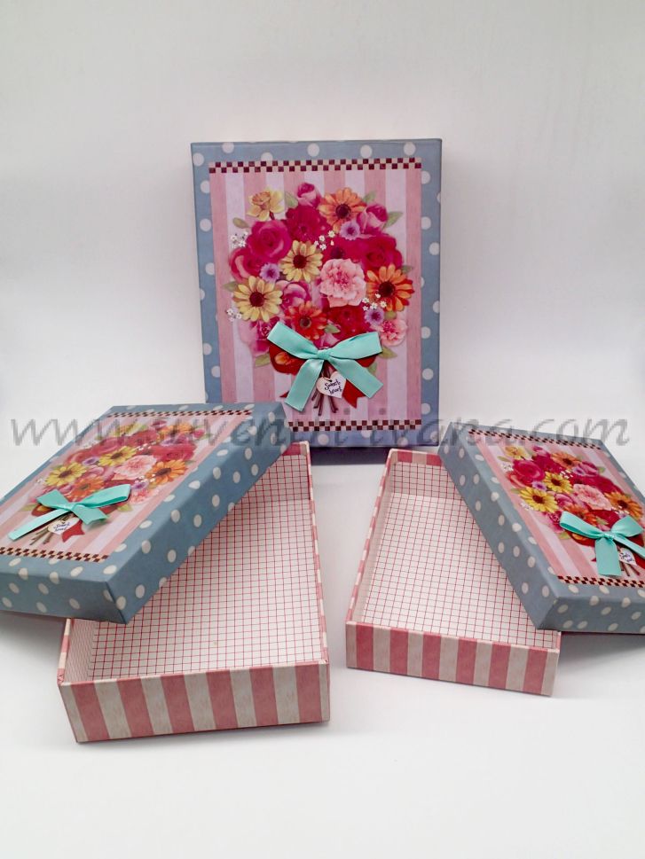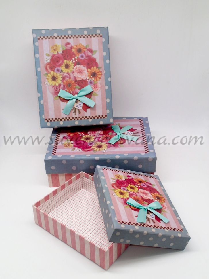 Опаковъчни правоъгълни кутии за подаръци с букет цветя на капака. Изработени от твърд картон с панделка за декорация, комплект 3 броя. Размери: голяма - 24,0 х 18,5 х 8,0 см. средна - 22,0 х 17,0 х 6,5 см. малка - 18,5 х 14,5 х 5,0 см. Подходящи за опаковане на всякакъв вид подаръци.