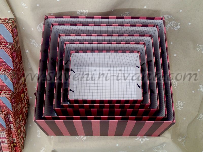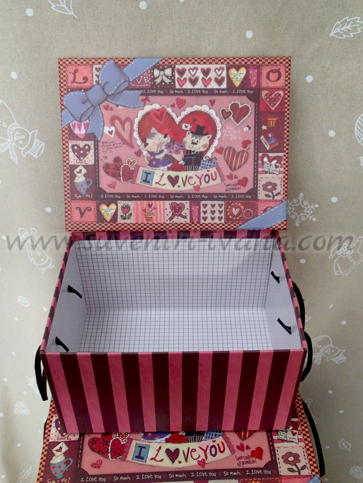 Опаковъчни правоъгълни кутии за подаръци на сърца с надпис I Love You на капака. Изработени са от картон, комплект 5 броя. Размери: 40,0 х 21,5 х 36,0 см. 36,0 х 19,0 х 32,0 см. 32,0 х 17,5 х 26,5 см. 28,0 х 22,5 х 15,0 см. 24,0 х 13,5 х 18,0 см. Подходящи за опаковане на коледните подаръци.
