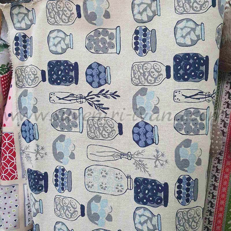 Плат с буркани, плодове и билки в синя гама. Подходящ за кухненски текстил, декорация и DIY проекти. Ширина на плата 156 см.