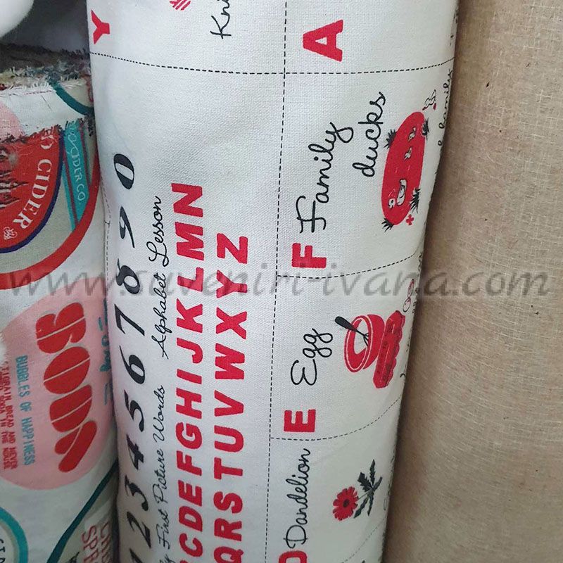 Декоративен детски плат с букви, цифри и илюстрации, подходящ за шиене, игра и образователни проекти. Ширина на плата 157 см.