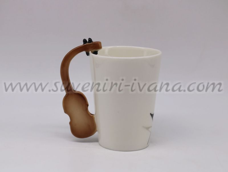 Бяла порцеланова чаша с музикални ноти и дръжка с формата на виола в естествен цвят. Размери 11,0 х 7,2 см. Чудесна идея за подарък за любителите на класическата музика.