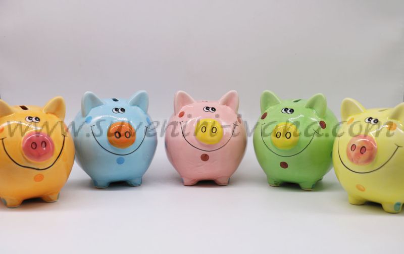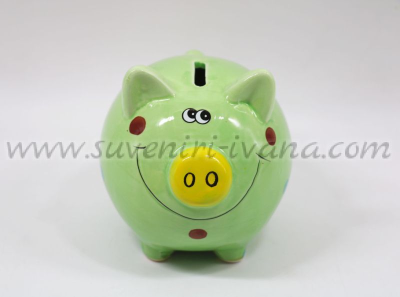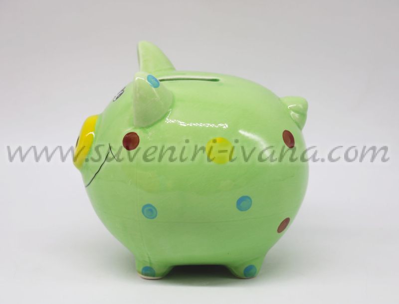 Детски керамични касички 'Веселите прасенца'. Размери 12,0 х 10,0 х 11,0 см. Касичката е зелена на цветни точки и е подходяща за събиране на монети и дребни банкноти. Чудесен подарък за всяко дете.