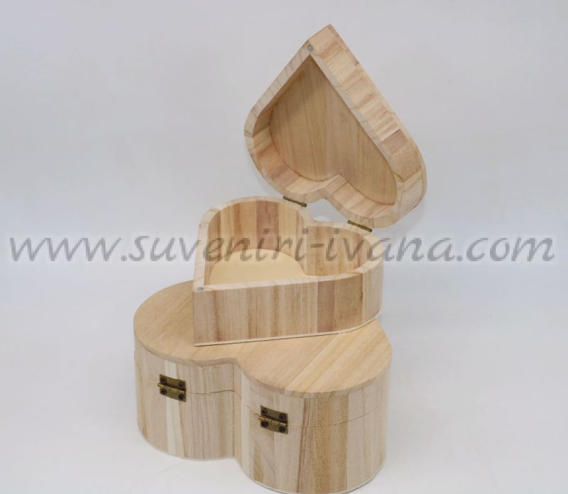 Комплект два броя дървени кутии от натурално дърво с формата на сърце, подходящи за декупаж и всякакъв друг вид декорация. Кутиите се затварят посредством магнит. Размери: голяма - 16,5 х 15,5 х 7,5 см. малка - 13,0 х 12,5 х 6,0 см.