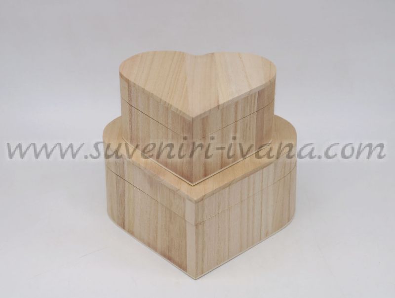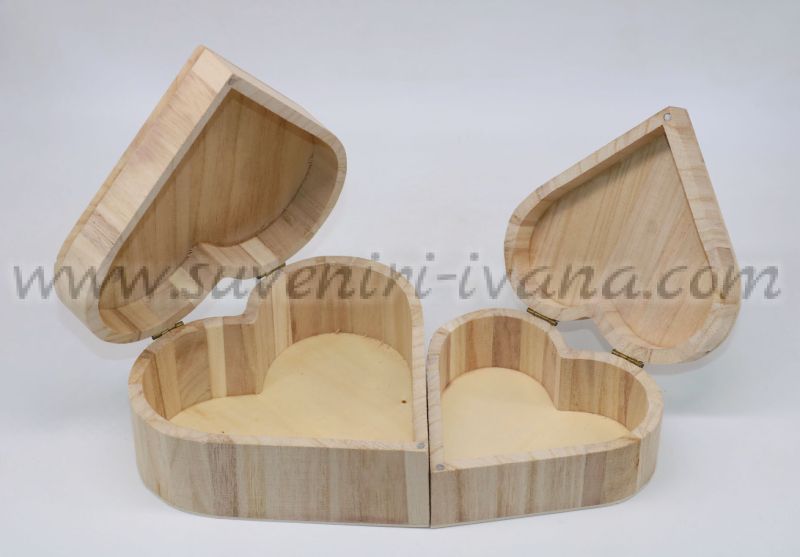 Натурални дървени кутии сърце, комплект два броя. Размери: голяма - 16,5 х 15,5 х 7,5 см. малка - 13,0 х 12,5 х 6,0 см. Кутиите са с магнитно затваряне. Подходящи за декориране и обработване чрез прилагане на различни арт техники.