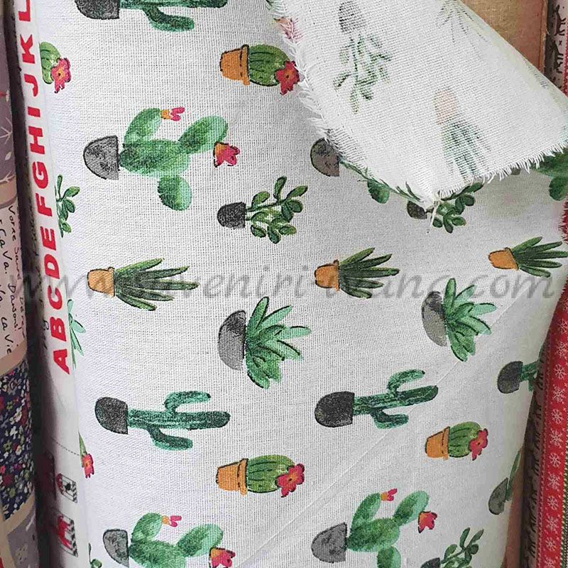 Нежен плат с малки кактуси в саксии, акварелен стил върху бял фон – идеален за декорации, аксесоари и подаръци. Ширина 150 см.