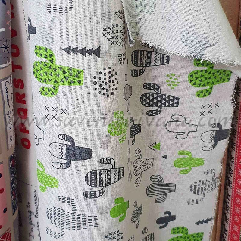 Стилен плат с десен от различни кактуси в разнообразни форми и шарки, комбинирани в модерна цветова гама от зелено, сиво и черно. Дизайнът е свеж и съвременен, подходящ за различни творчески проекти.